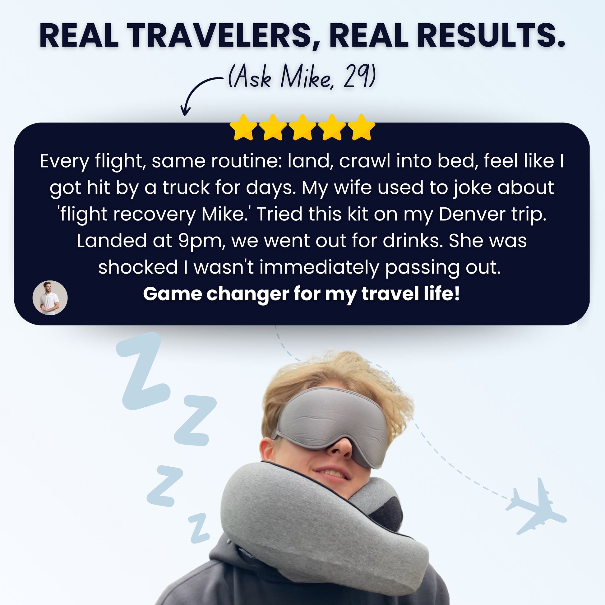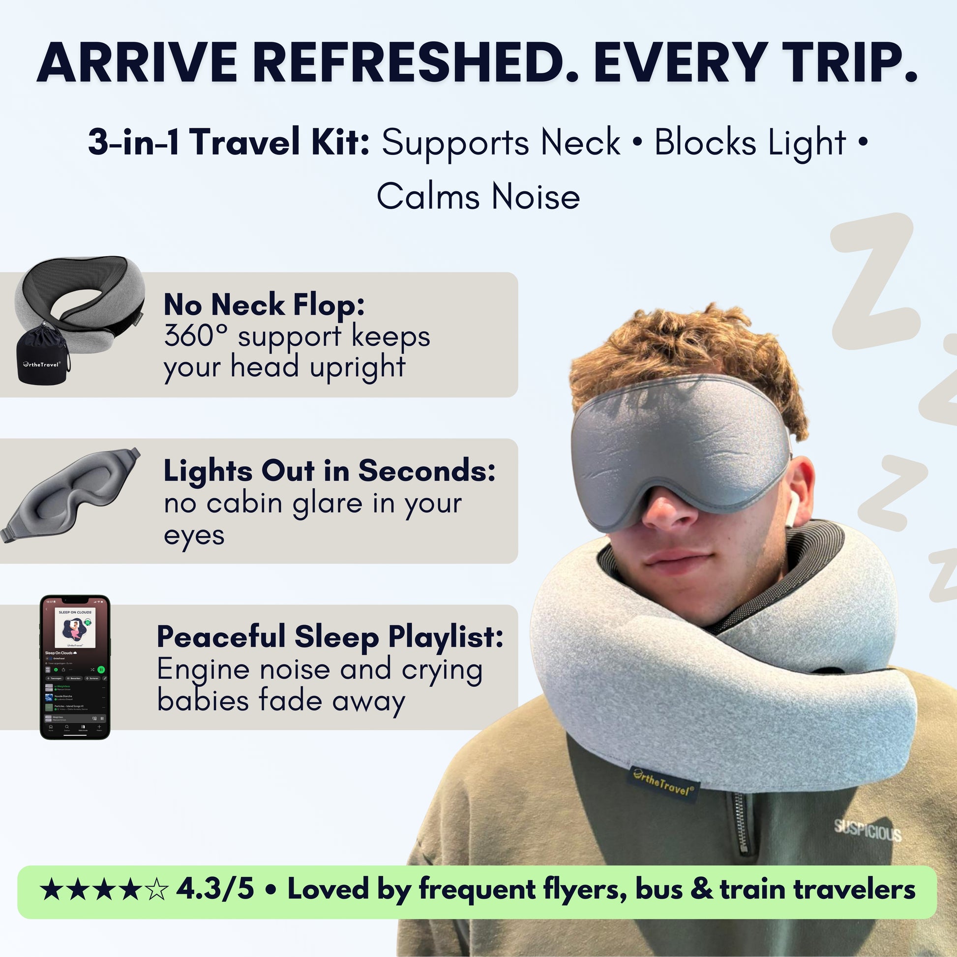 The OrtheTravel Kit™ is designed to turn exhausting travel into restorative rest. In just a few seconds, you slip into a setup that blocks cabin light completely, silences engine noise, and supports your head in perfect alignment. No more neck bobs, no more interruptions — just deep, refreshing sleep.
